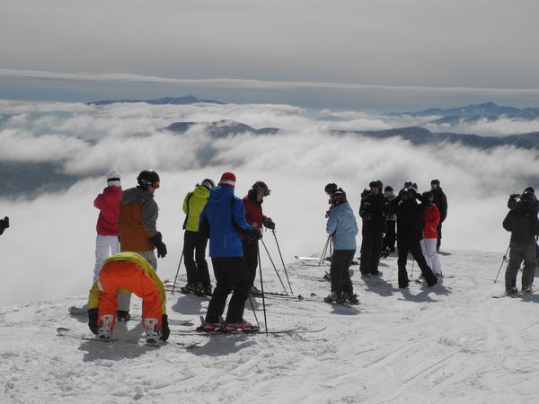 A crowd of skiers and snowboarders enjoy the view above the clouds recently at the summit of the Whiteface Mountain Ski Area. As of Monday, March 18 the ski area had 66 trails open on a primary surface of packed powder, according to the mountain’s daily report. A winter weather advisory is currently in effect for the Adirondack Region, with about 12 inches of snow expected, according to The Weather Channel. Season passes for the 2013-14 ski season at Whiteface went on sale March 10 and include the remainder of this season. For more information, call 518-946-2223 or visit www.whiteface.com. Photo/Richard Rosentreter/Lake Placid News