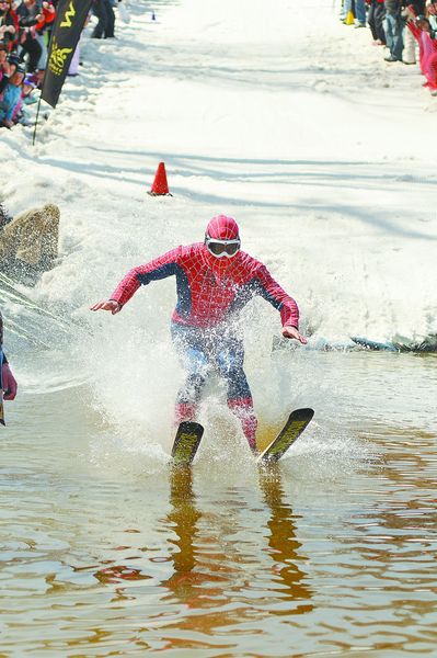 A skiers a.k.a Spiderman hits the pond during a previous Pond Skimming event at the Whiteface Mountain Ski Area in Wilmington. The popular event is scheduled to take place Sunday, April 7 at the ski area. The event begins at 1 p.m. and prizes will be awarded from Maui North, Cunningham's ski bar and Viking Ski shop for distance, costume and biggest splash. Participants must sign up at the guest service desk and the event is limited to 100 participants. For more information, call 518-946-2223 or visit www.whiteface.com. Lake Placid News file photo