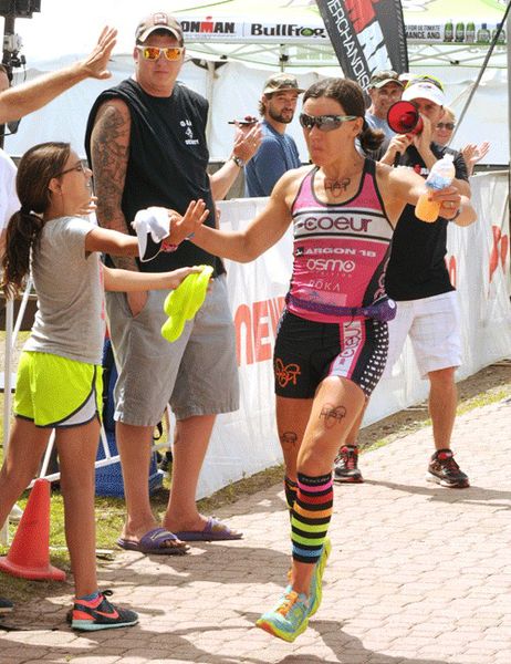 Tupper Lake's Amy Farrell high-fives her daughter Ruby after beginning in run as the women's overall leader in Sunday's Ironman Lake Placid. (News photo - Lou Reuter)