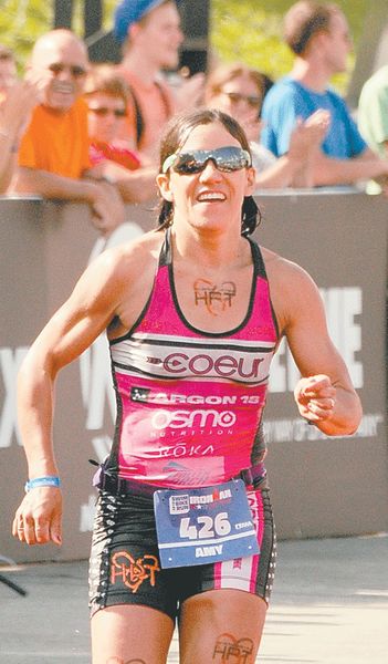 - Amy Farrell of Tupper Lake nears the finish line as the women’s champion of the Ironman Lake Placid triathlon Sunday. (News photo – Lou Reuter)