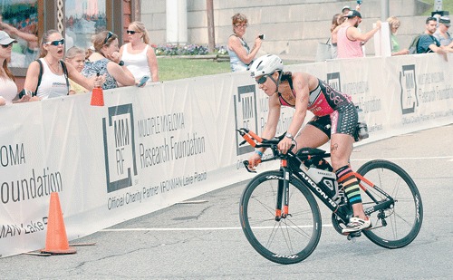 - Tupper Lake’s Amy Farrell nears the end of her bike ride during Sunday’s Ironman Lake Placid race. Farrell held the overall women’s lead starting the run. (News photo – Lou Reuter)