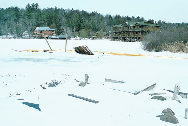 A piece of an old boathouse sticks out of the ice in Ampersand Bay in Saranac Lake. The dilapidated boathouses at this site and in Crescent Bay were removed last month as part of a plan to replace them with new covered docks. (News photo — Chris Knight)