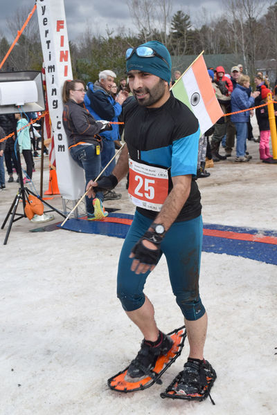 Tanveer Hussain of India carries his country's flag after crossing the finish line in the World Snowshoe Championships Feb. 25 in Saranac Lake. (News photo — Chris Knight)