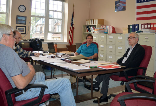 Adirondack Experience Executive Director David Kahn, right, confronts Lake Placid municipal officials including North Elba town Assessor Todd Anthony, next to him, in May 2015. (News photo — Antonio Olivero)