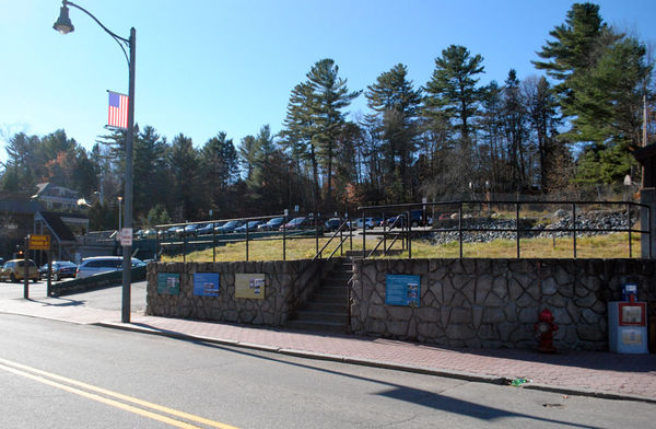 The Adirondack Experience owns this property with the stone retaining wall on Main Street in downtown Lake Placid, next to a village parking lot. The village wanted to take the land by eminent domain and build a parking garage there but was rejected by the state Supreme Court. (News photo — Matthew Turner)