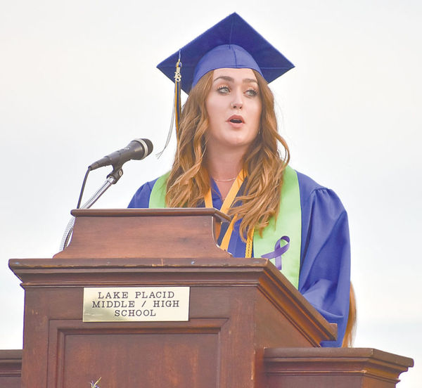 Valedictorian Graci Daby delivers her speech at the Lake Placid High School graduation ceremony Friday, June 22. (News photo — Griffin Kelly)