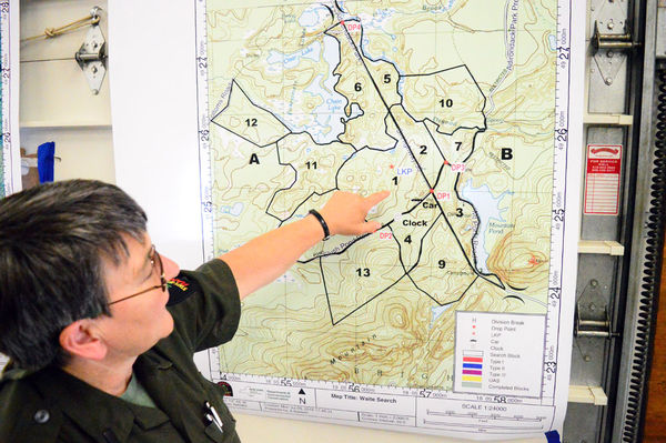 State forest ranger Lt. Julie Harjung, who is leading the search for a Bangor man missing in the Paul Smiths area for three weeks, points at the areas ground crews have searched in the Slush Pond Road area. (News photo — Aaron Cerbone)