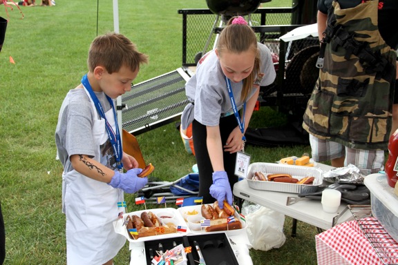 Members of the Hokie Pokie Q Jr. barbecue team, of Stow, Massachusetts, prepare their hot dog entry for the kids’ cooking competition. From left are 8-year-old Brandon Abrutyn and 11-year-old sister Rachel. Their brother, 14-year-old Drew, cooked for the youth competition. (News photo — Andy Flynn)