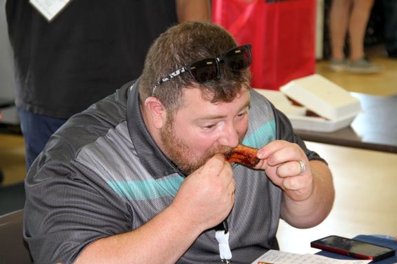 - Judge Ed Basso, manager at the Lake Placid Hannaford supermarket, tastes a pork rib for the youth competition. (News photo — Andy Flynn)