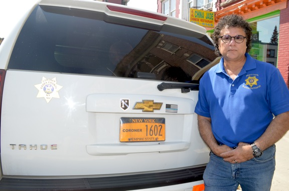 Essex County Coroner Frank Whitelaw, of Bloomingdale, poses beside his Chevy Tahoe in downtown Saranac Lake in September 2017. (News photo — Antonio Olivero)