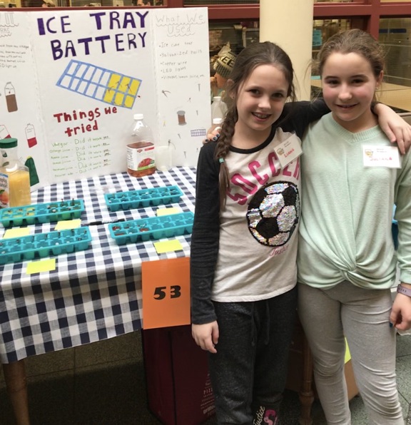 Juliana Tremblay and Liana Shambo stand next to their winning K-5 science project, Ice Tray Batteries with Different Liquids. (Photo provided — Sarah Tremblay)