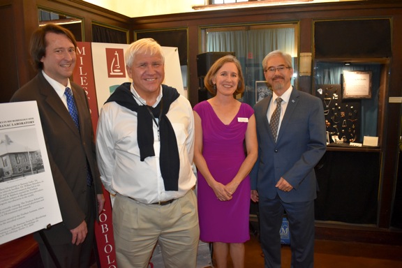 From left, Trudeau Institute researcher Brian Weinrick, microbiology and immunology scientist Bill Jacobs, Historic Saranac Lake Executive Director Amy Catania and Trudeau Institute President Atsuo Kuki pose at a “Milestone in Microbiology” ceremony Friday, Oct. 11 at the Saranac Laboratory Museum. (News photo — Griffin Kelly)