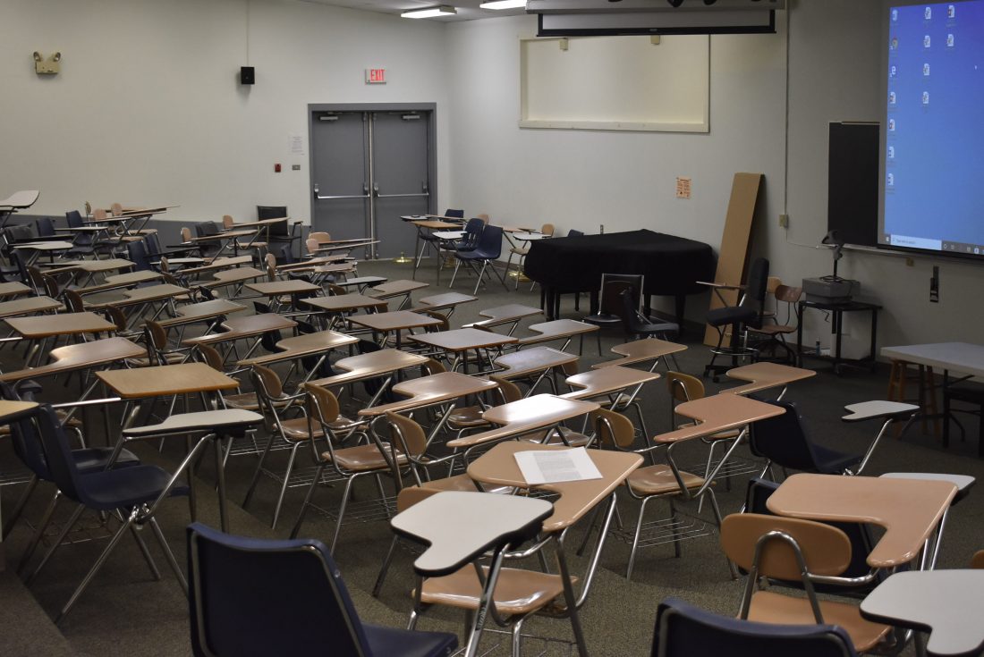 An empty classroom is seen at North Country Community College in Saranac Lake Wednesday. SUNY and CUNY schools are set to switch to distance learning amid the novel coronavirus pandemic, leaving some classrooms empty until the end of the spring semester. (News photo — Griffin Kelly)
