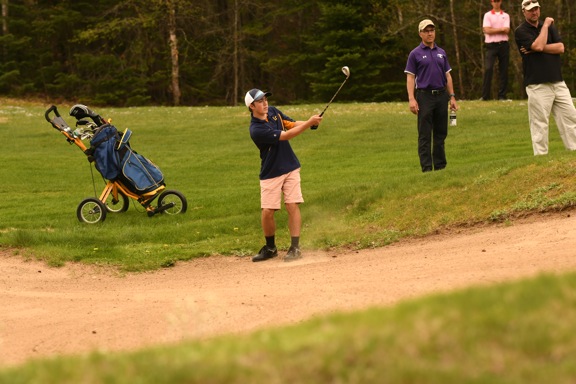 Lake Placid’s Hunter Wilmot — now a senior — chips onto the 12th green at the Craig Wood Golf Club during the opening day of the Section VII golf championships on May 23, 2019. The team claimed its third straight Section VII title and fourth in five years that day. (News photo — Lou Reuter)