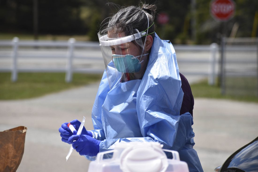 Adirondack Health Assistant Vice President of Patient Care Services Carrie Reardon prepares a COVID-19 test at a mobile testing clinic in Lake Placid on Wednesday. (News photo — Elizabeth Izzo)