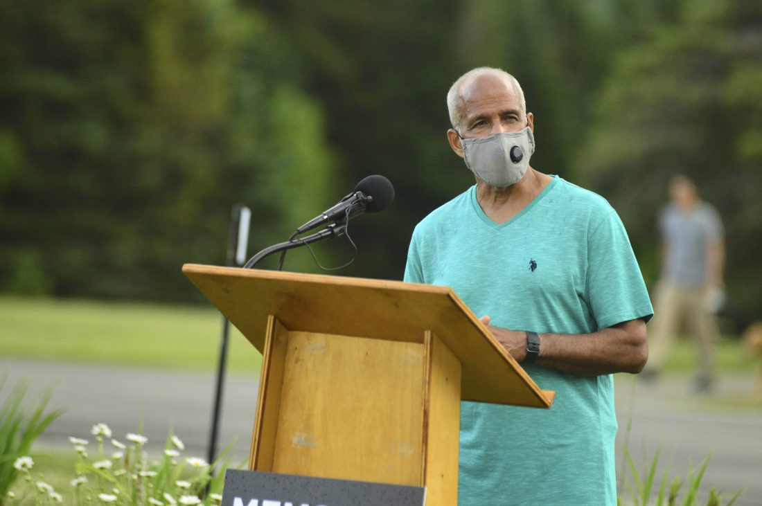 Jose Saldana delivers excerpts from abolitionist Frederick Douglass’s “What to the Slave Is the Fourth of July?” speech at the John Brown Memorial Sunday, July 5. (News photo — Aaron Cerbone)