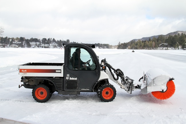 - North Elba Park District employee Tracy Daby takes off in the Bobcat to remove more snow on Mirror Lake Thursday, Feb. 25. He had already cleared the rinks in front of the beach house and the outrun of the Lake Placid Toboggan Chute and was heading over to help prepare the ice for the upcoming CAN/AM Pond Hockey Tournament. (News photo — Andy Flynn)