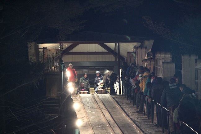 Four employees usually work the chute at a time, some in the ticket booth/toboggan shed and some on top of the structure getting people on the sleds and sending them down to the ice. Three to four people are put on each sled. And while there are two runs, side by side, it is only safe for one toboggan to go down at a time. Once the people on the ice are off the sled and on their feet, another toboggan can be sent down.