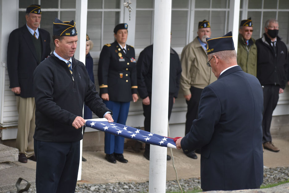 American Legion Post 326 Commander Stuart Spotts, left, folds a flag with Bob Marvin on Memorial Day during the flag ceremony at the Legion post on Main Street, Lake Placid. (News photo — Elizabeth Izzo)