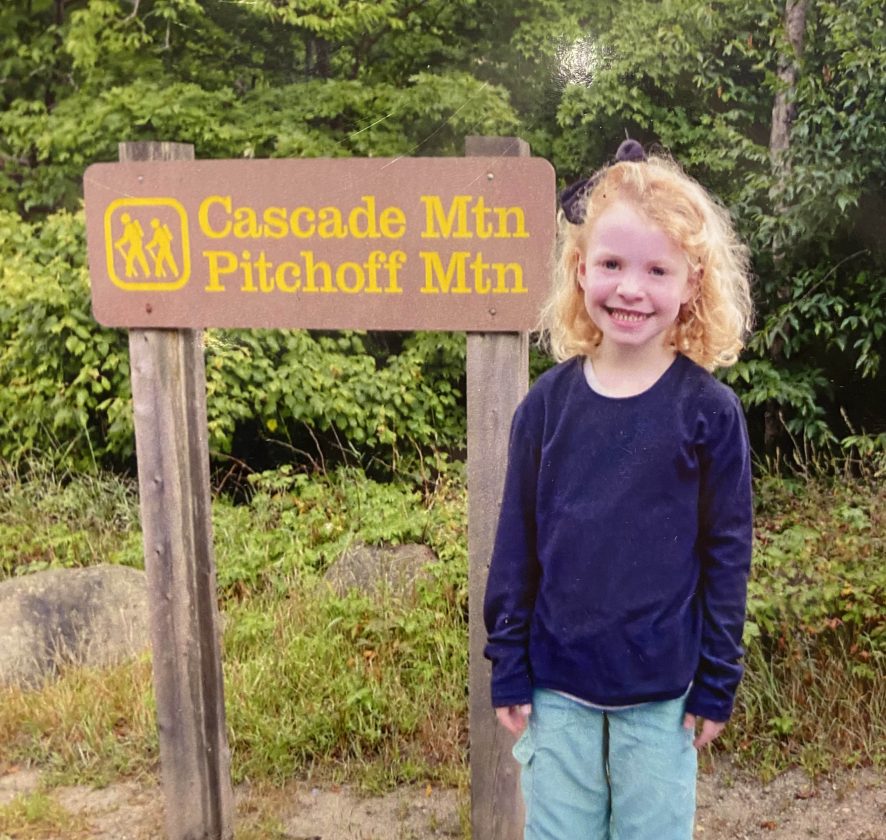 Norah Galvin, at 5 years old, poses by the Cascade Mountain trailhead sign on Aug. 28, 2012. (Photo provided)