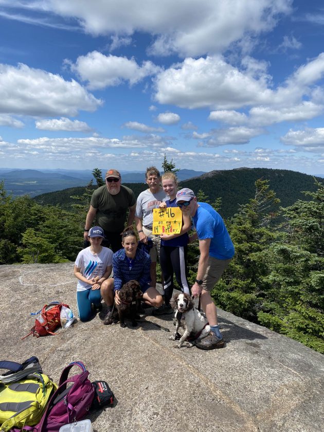 - Norah Galvin celebrates reaching the summit of Porter Mountain, her last of 46 mountains, officially becoming a 46er on her 14th birthday. Pictured, back row, left to right, are Eric Galvin, Chris Beattie, Norah Galvin and Marc Galvin. In the front row is Zarela Gulli, Sarah Galvin and dogs Fern and Woodie.(Photo provided)