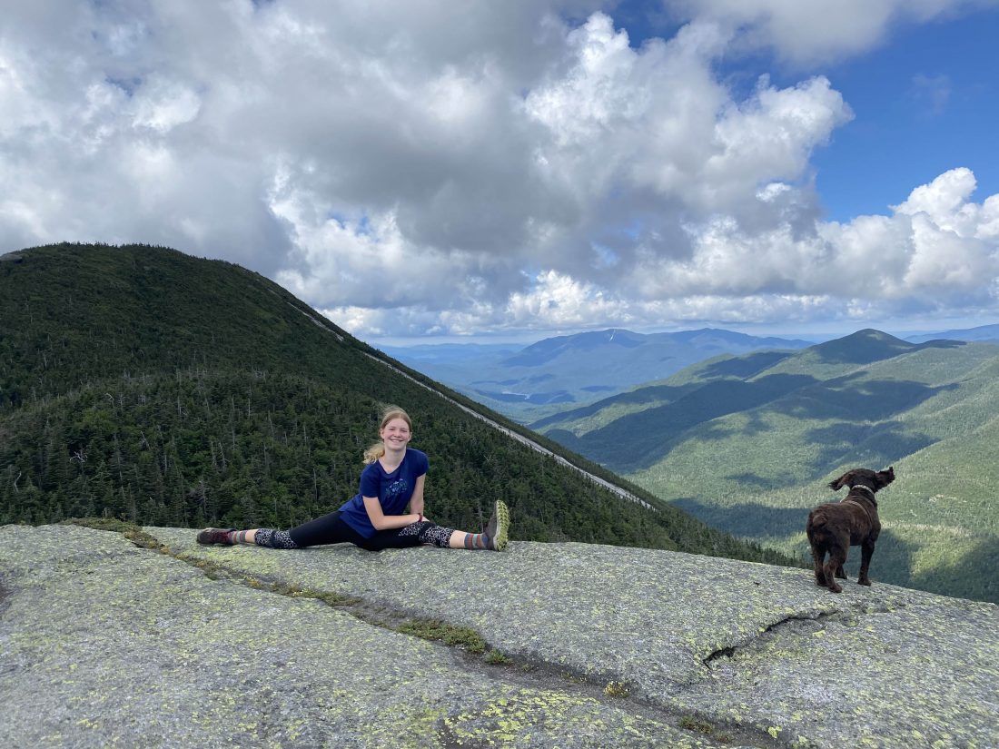 - Norah Galvin does a split at the summit of Mount Colden on July 30, 2020 as her dog, Fern, takes in the view. (Photo provided)
