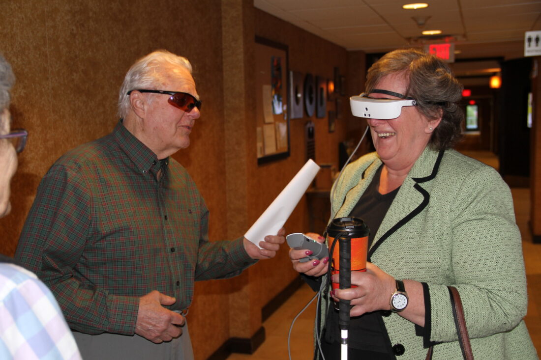 There’s a point in every Rotary Club meeting where members can offer a dollar to the general fund, naming one thing they are thankful for. It’s called Happy Dollars. On May 24, 2018, as she wore her eSight glasses for the first time in a Rotary meeting, Leonard dug out three dollars.