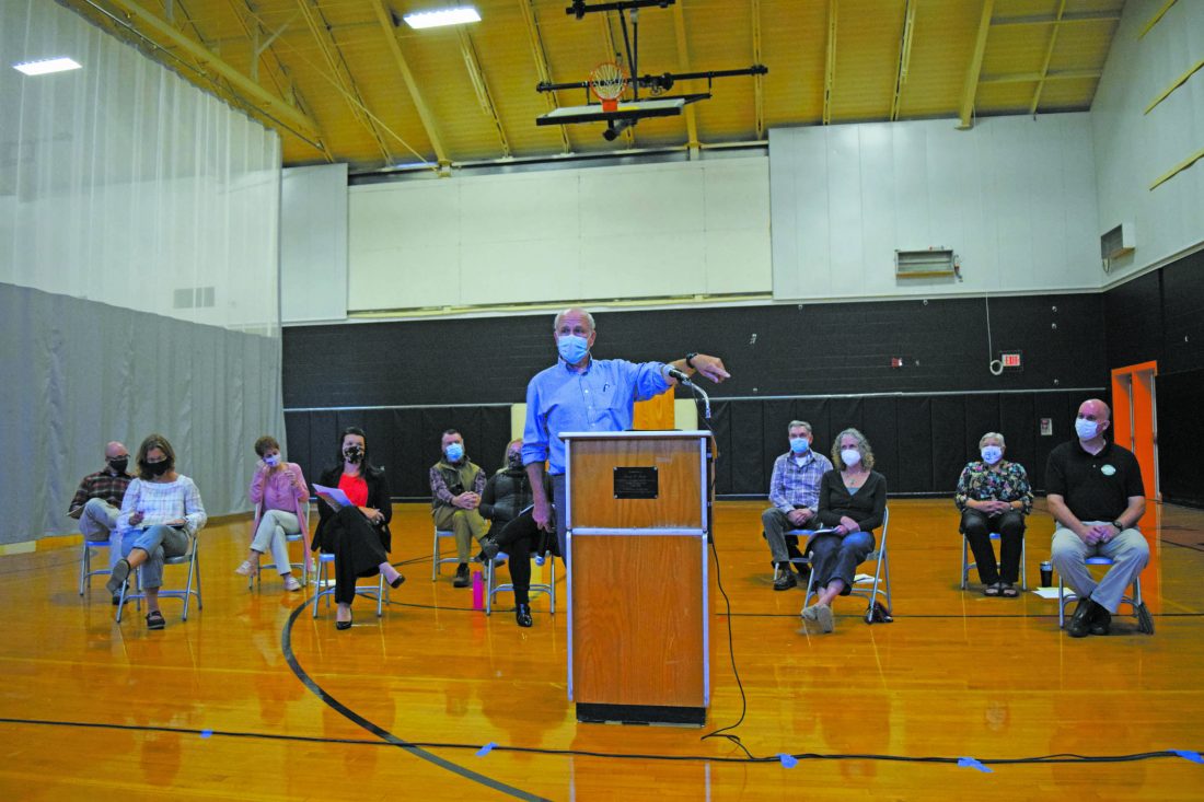 Peter Slocum, moderator for the Keene candidates forum, presents the 2021 election candidates on Sunday, Sept. 26. (News photo — Lauren Yates)