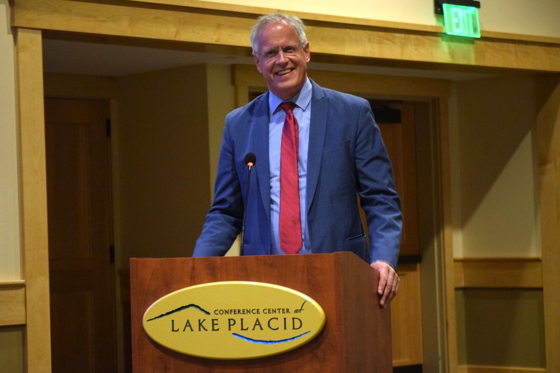 New York State Office of Parks, Recreation and Historic Preservation Commissioner Erik Kulleseid speaks about the newest state budget in Lake Placid Monday, May 16. (News photo — Lauren Yates)