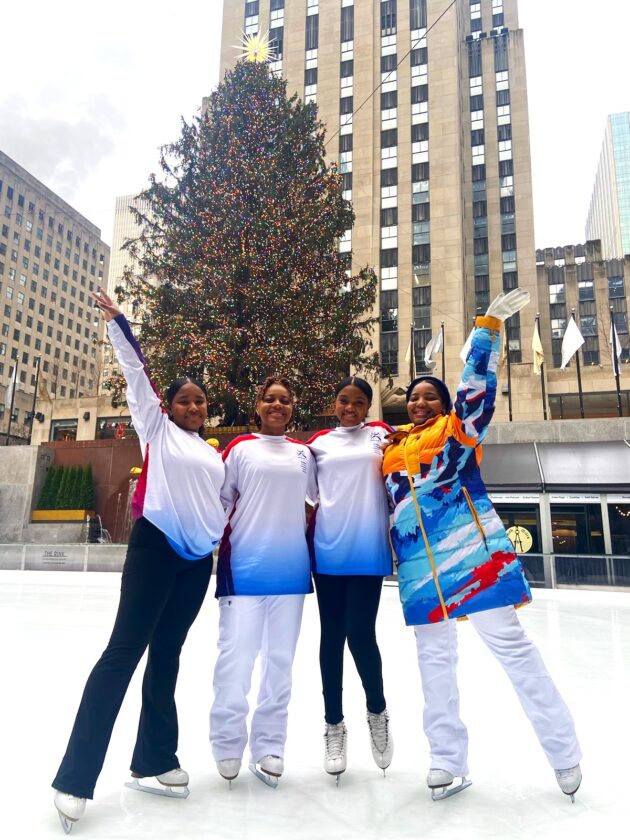 Figure Skating in Harlem figure skaters Emily Delbrum, Nadia Neil, Adrianna Walker and Ariynna Peal Tuesday, Jan. 3 helped to unveil the Lake Placid 2023 FISU World University Games medal ceremonial Jacket, which will be worn by medal presenters during each of the Lake Placid 2023 FISU Games’ medal ceremonies. The jacket was designed and created by students from New York City’s Fashion Institute of Technology. (Provided photo — Lake Placid 2023 FISU World University Games Organizing Committee)