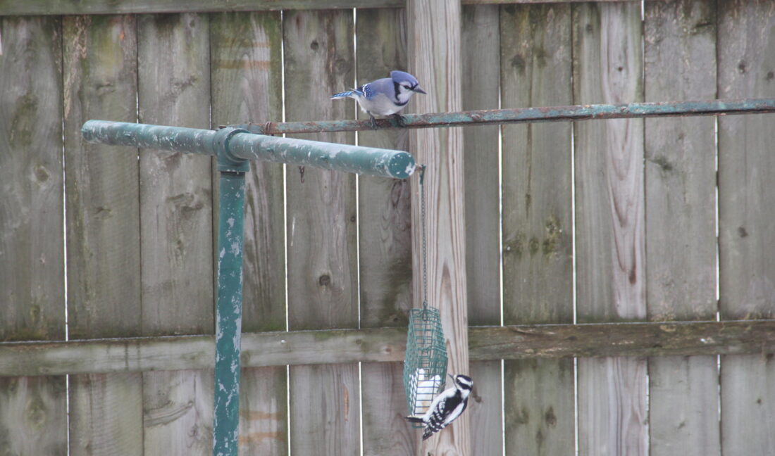 Photo of blue jay and downy woodpecker by Andy Flynn