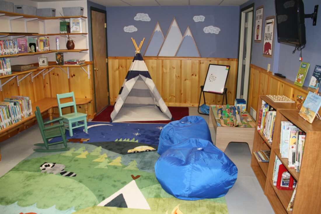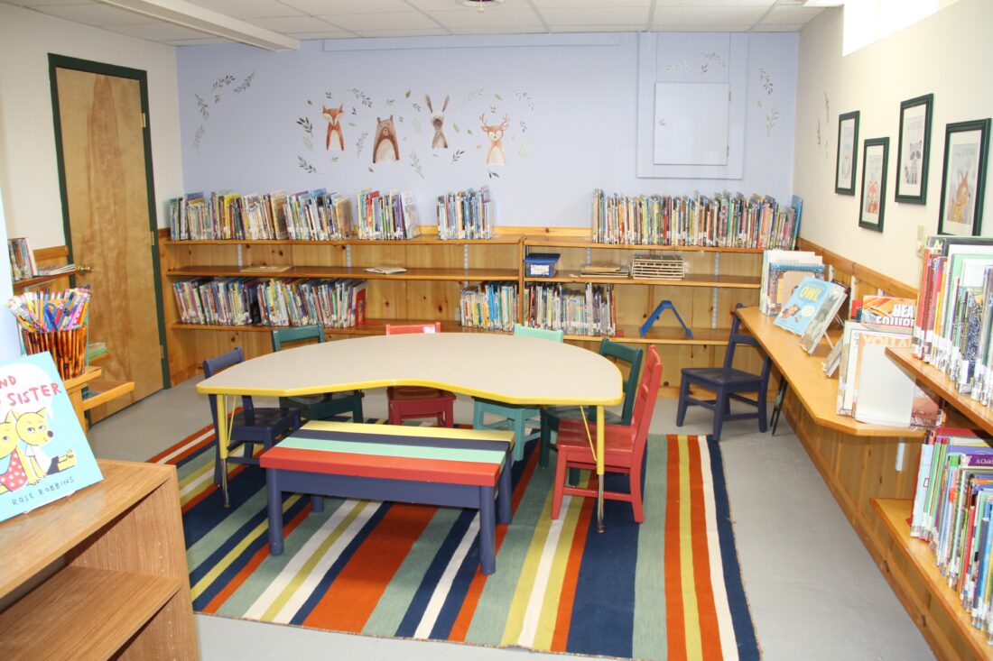 The public computers were cut from four to two, and they were moved from the back of the library to the front, next to the door. Adult fiction is on stacks to the left of the fireplace, books on tape and movies to the right, non-fiction behind the fireplace, an Adirondack book section on the back right and juvenile books on the back left. The children’s floor in the basement has also been revamped and includes a camping theme in one room.