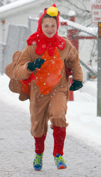 Lake Placid runner Kai Frantz stays warm and gets in the holiday spirit during the 2016 Turkey Trot race. (Photo — Roy Bombard)
