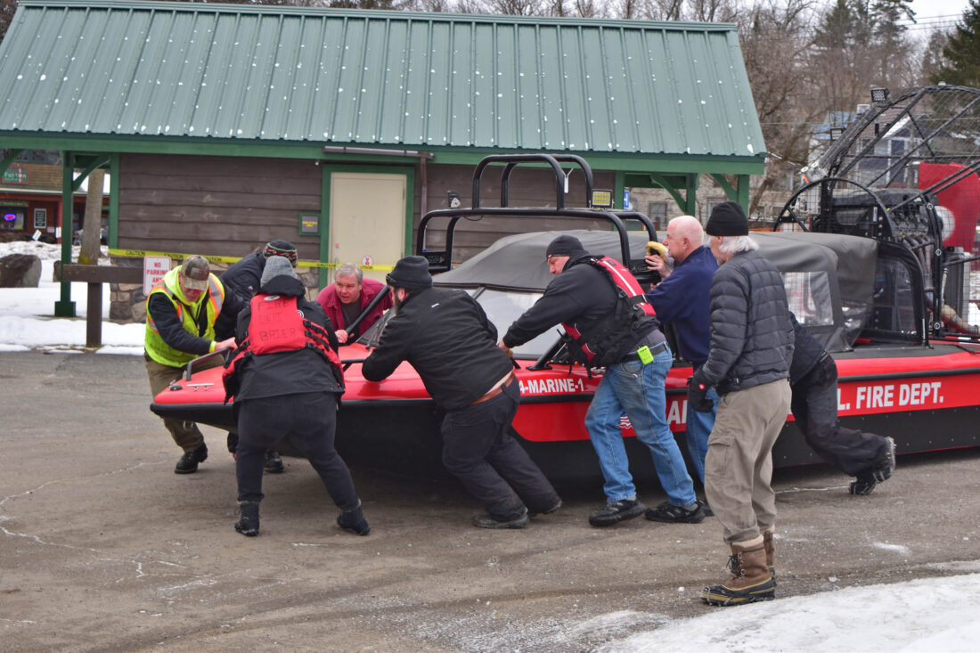 Members of the Saranac Lake Volunteer Fire Department and Ice Palace Workers 101 help launch the fire department’s airboat from the Lake Flower boat launch on Monday after a snowmobiler was reported to have gone through the ice down the lake. The snowmobiler was rescued by a friend and a pedestrian and the fire department chief is urging caution on the ice right now. (News photo — Aaron Marbone)