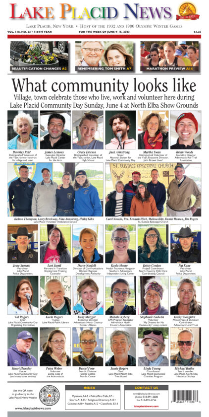 – Best Front Page, Division 2, second place, Andy Flynn, Lake Placid News. The three entries included the front page of the June 9 issue featuring headshots from Lake Placid Community Day with the headline, “What community looks like.” “The front-page designer uses creativity well. The cover of mug shots for Community Day was compelling. The use of photos is outstanding. The reader can follow the design well.”