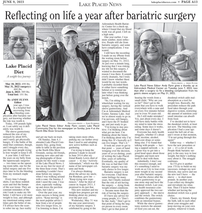 – Best Column, Division 1, first place, Andy Flynn, Lake Placid News. For the “Lake Placid Diet” column. “It takes a whole lot of vulnerability to share a personal journey in the newspaper, as you must know. Not only did you share your weight loss journey, you shared the most intimate parts of your journey and that takes a lot of courage. It’s a powerful testament. Cheers to you and I wish you well in your journey.”