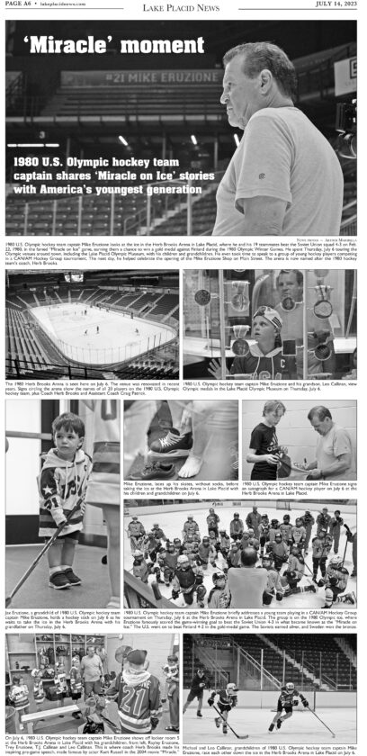 – Picture Story, Division 1, first place, Arthur Maiorella, Lake Placid News. For a picture story on 1980 U.S. hockey team captain Mike Eruzione’s tour of Olympic venues with his grandchildren. “Tells story while setting mood, excellent variety of photos.”