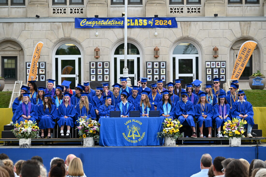 The 37 seniors in the Lake Placid High School Class of 2024 are seated in front of the middle-high school Friday evening, June 21, during the commencement ceremony. (News photo — Delainey Muscato)