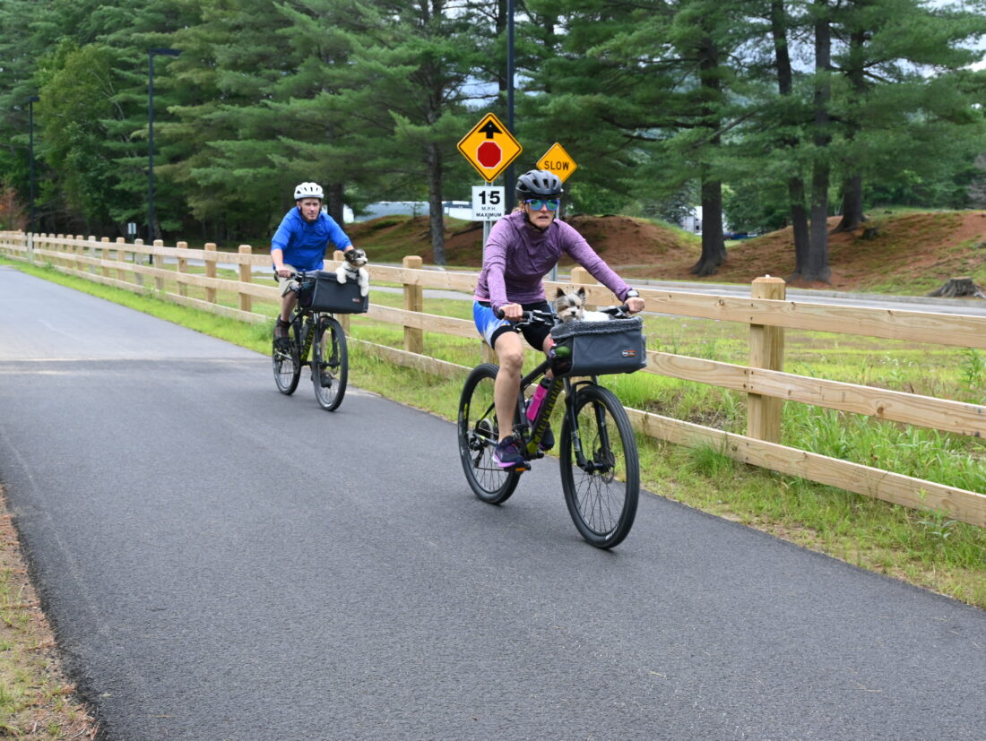 - Two bikers take their dogs for a ride on the Adirondack Rail Trail in Saranac Lake on Thursday, July 25. (News photo — Delainey Muscato)