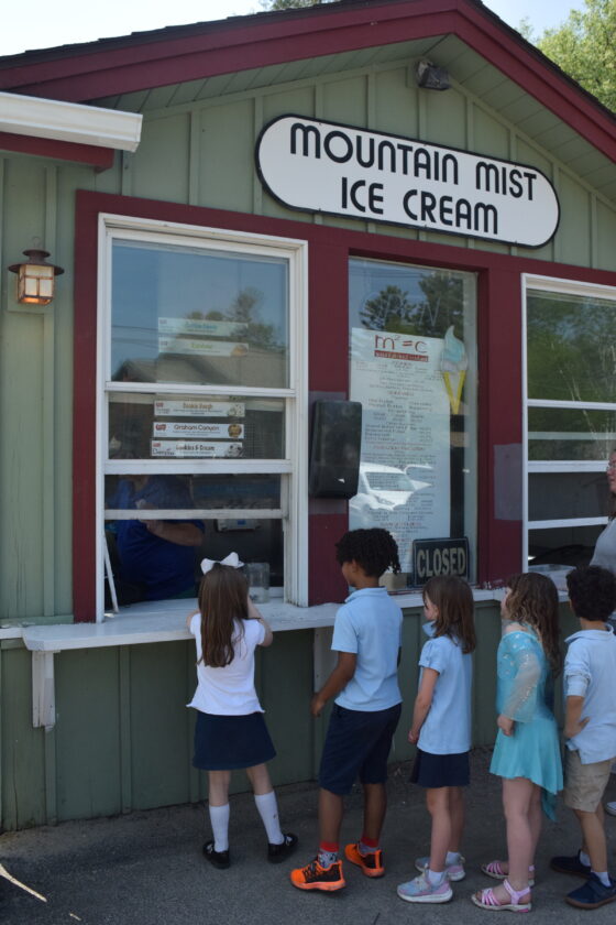 Kids from the St. Agnes School after-school program line up for ice cream on a hot day at the beginning of June. The school is set to host Lake Placid’s first birth-to-three child care program in the fall. (News photo — Grace McIntyre)