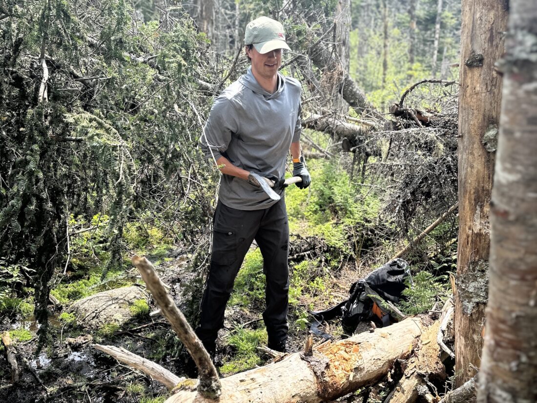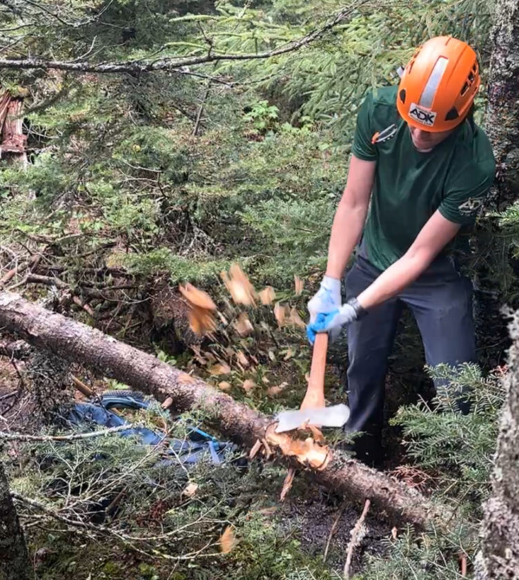 - A member of the Adirondack Mountain Club’s professional trail chops away at a log on June 7, which happened to be National Trails Day, in the Johns Brook Valley in the town of Keene. (Provided photo — Kayla White)