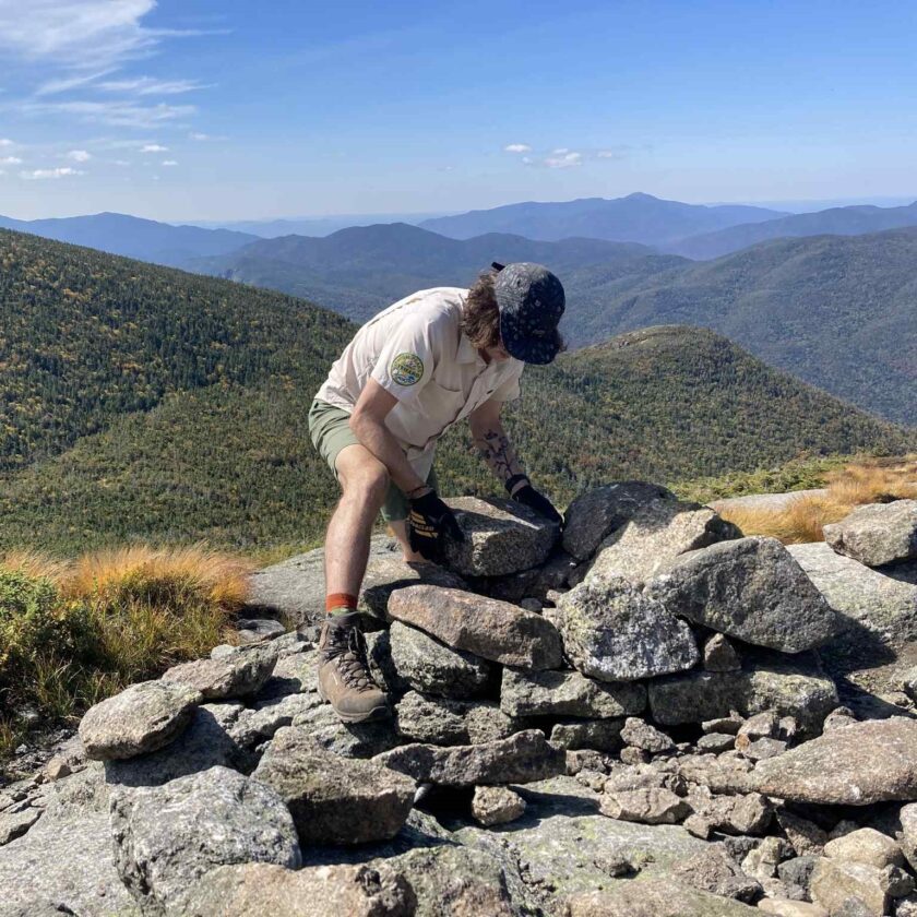 ADK Stewardship Manager Liam Ebner begins rebuilding a cairn on Wright Peak on Tuesday, Sept. 16. (Provided photo — Adirondack Mountain Club)