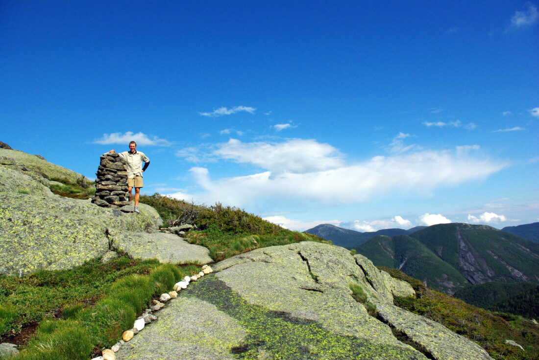 - Aaron Sirtoli stands next to a cairn on Wright Peak in summer 2008, when it was first completed, demonstrating how large the cairns were. Sirtoli was a summit steward at the time. (Provided photo — Adirondack Mountain Club)