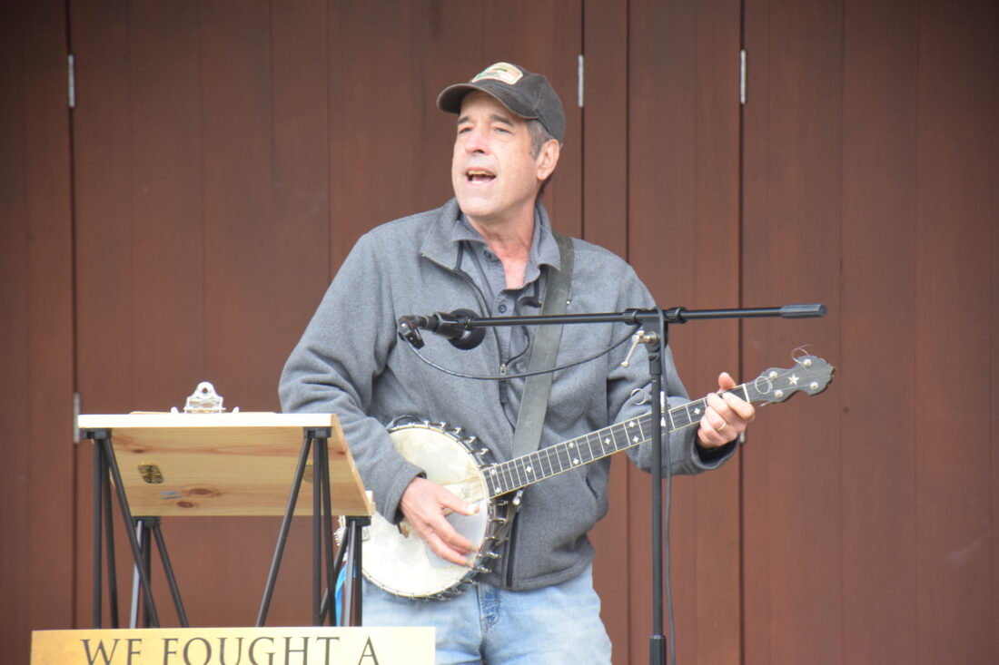 Curt Stager, a climate scientist, at Paul Smith's College natural science professor and musician, closes out the "No Kings" rally in Mid's Park in Lake Placid on Saturday, Oct. 18 by leading the crowd in song. (News photo — Chris Gaige)