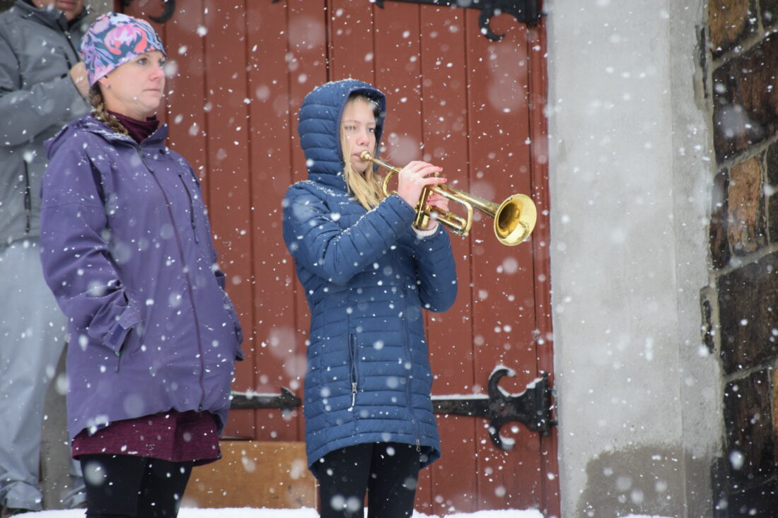 News photo by Chris Gaige Seventh grader Annalyse Gerken plays taps next to the Adirondack Community Church on Tuesday morning as the flag for her grandfather, Daniel Lundin, was raised as part of Lake Placid’s Veterans Day celebrations. Standing beside her is her mother, and Lundin’s daughter, Joni Gerkin.