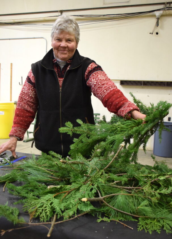 Pearl McCahill smiles as she assembles a swag at the Lake Placid Airport on Wednesday, Nov. 19. The Lake Placid Garden Club assembled approximately 100 swags that will be displayed around Lake Placid throughout the holiday season. (News photo — Chris Gaige)