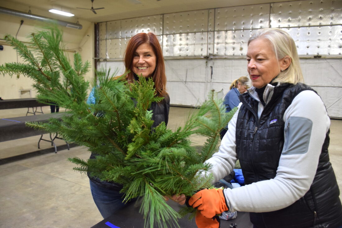 Judy Shea, left, performs a quality control inspection -- the final and most important step of the assembly process -- on a swag put together by Kathy Critelli at the Lake Placid Airport on Wednesday, Nov. 19. The Lake Placid Garden Club assembled approximately 100 swags that will be displayed around Lake Placid throughout the holiday season. (News photo — Chris Gaige)