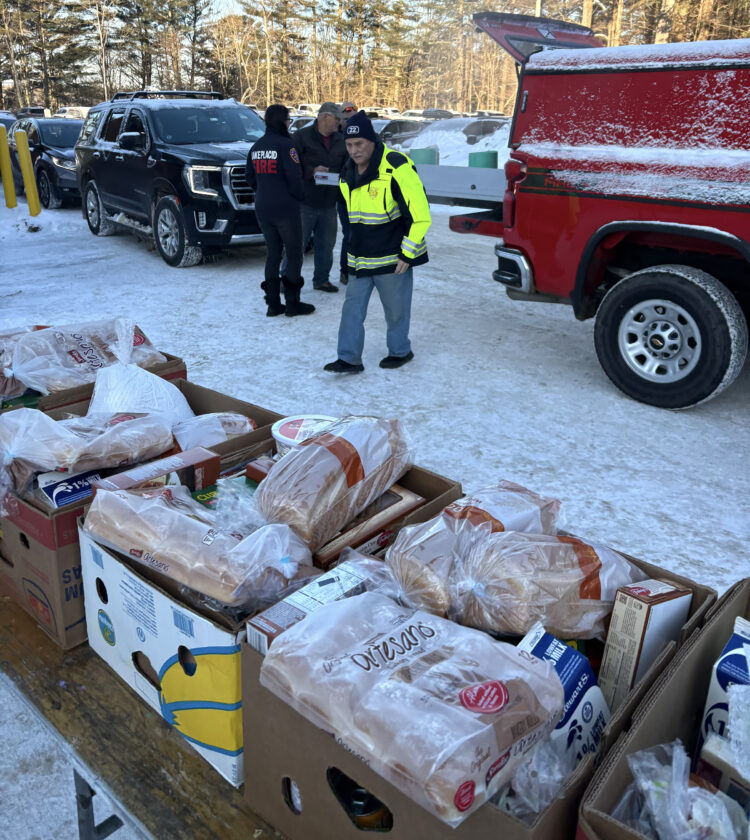 Lake Placid volunteer firefighters pack food donations last year as part of the North Elba Community Christmas Fund at the Crowne Plaza hotel on Dec. 14, 2024. (Provided photo — Zach Clark)