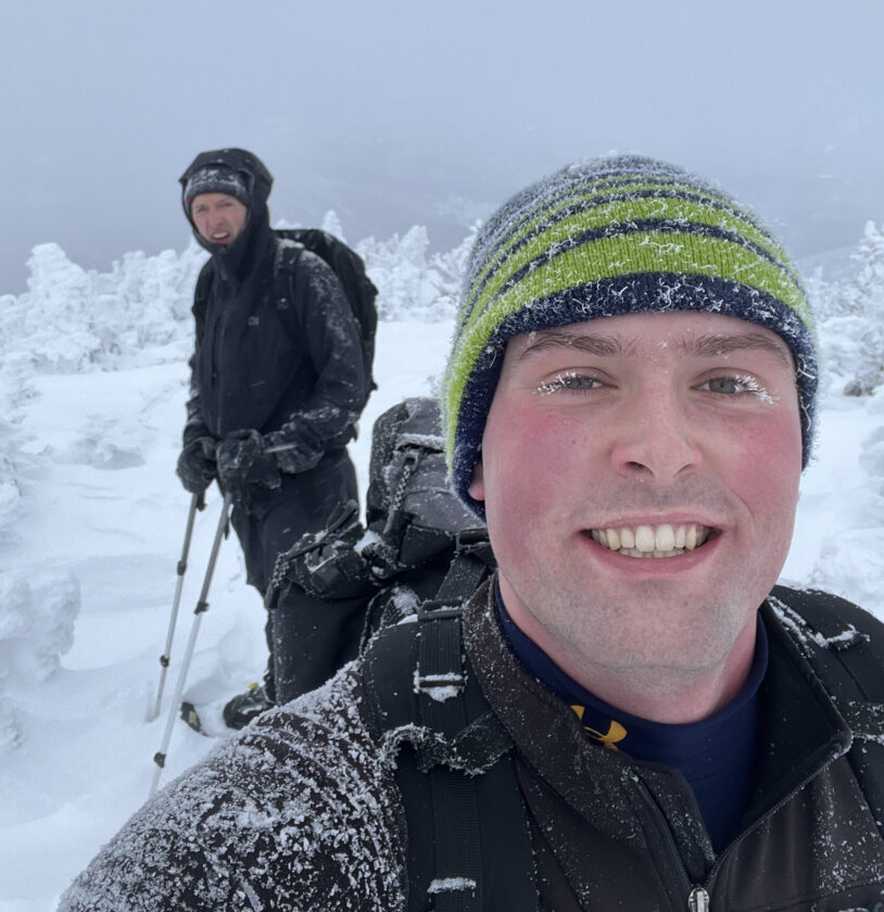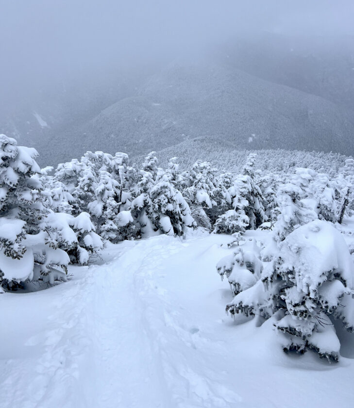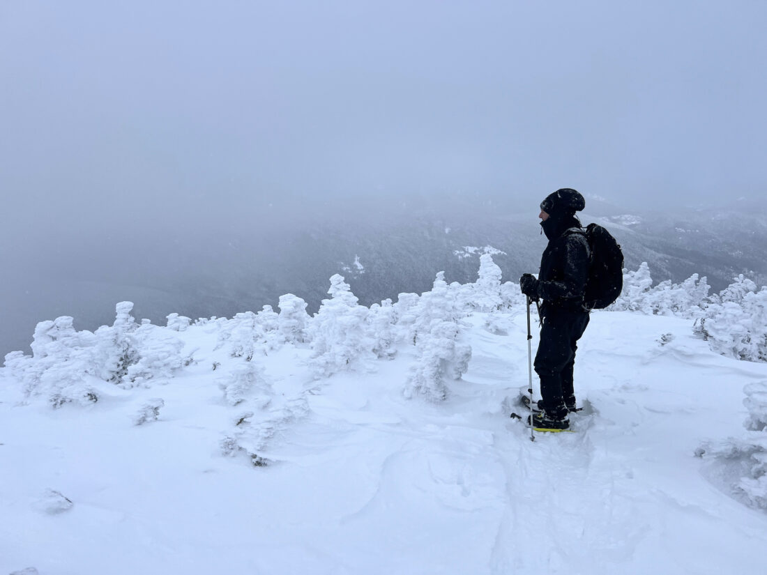 Just like Macomb, the summit stretch of the hike wasn’t without pitfalls. Spruce traps — where hidden pockets of air develop as snow falls around pine bows, creating sink holes when stepped over — were abundant. We picked our steps carefully and soon enough, found ourselves on top of Dix Mountain. While the views were absent, the elation was still all there.