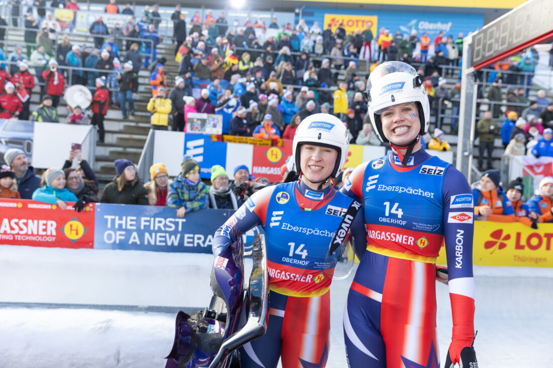 USA Luge’s Sophia Kirkby, left, and Chevonne Forgan smile after finishing a women’s doubles run during a FIL Luge World Cup in Oberhof, Germany, on Jan. 24. (Provided photo — FIL/Michael Kristen)